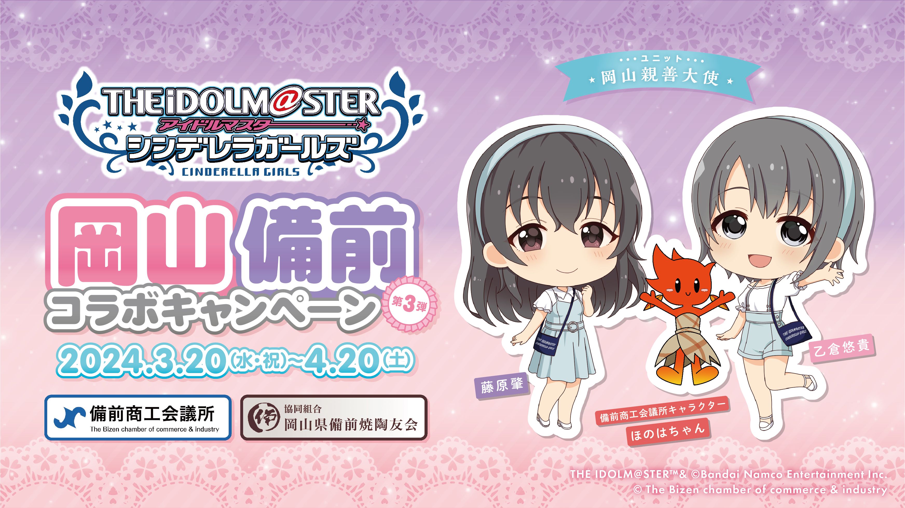 今回は、ユニット「岡山親善大使」の「藤原肇」と「乙倉悠貴」、備前商工会議所キャラクター「ほのはちゃん」の3人で